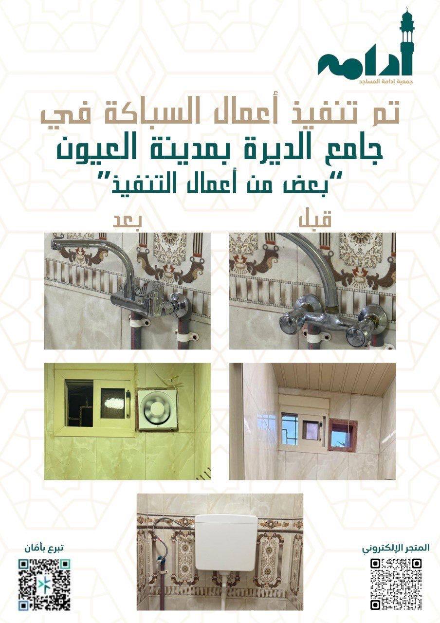تم تنفيذ أعمال السباكة في جامع الديرة بمدينة العيون، وذلك ضمن جهود تحسين وصيانة مرافق المسجد.نستعرض لكم جانبًا من أعمال التنفيذ قبل وبعد، والتي أسهمت في رفع كفاءة الخدمات وتهيئة بيئة مريحة للمصلين.
