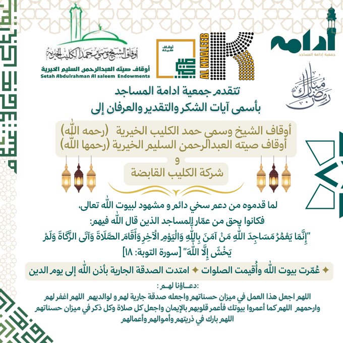 تتقدم جمعية إدامة المساجد في مدينة العيون بأسمى آيات الشكر والتقدير والعرفان إلى: